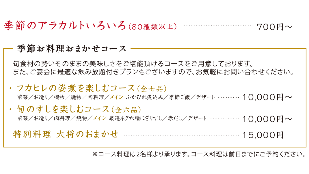 人数・予算に合わせた宴会プランのご予約も承ります。お電話にてお気軽にご相談ください。